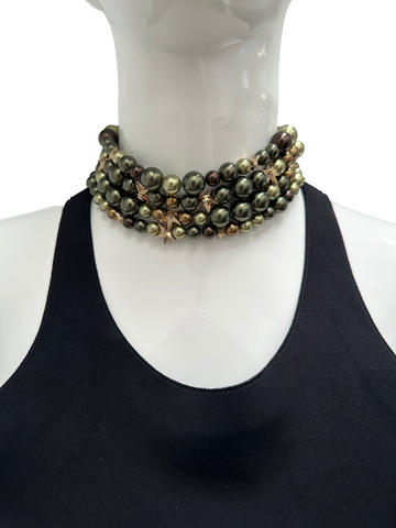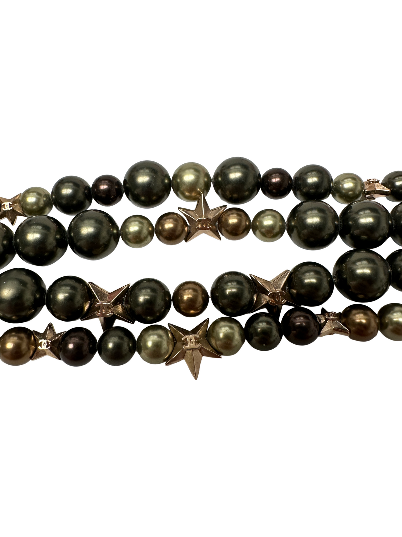 A stunning vintage Chanel statement necklace featuring three strands of iridescent pearls in deep olive, bronze, and anthracite hues. The necklace is adorned with delicate gold-tone star charms—an iconic Chanel detail that adds a celestial, couture-inspired touch.Crafted with Chanel’s signature elegance, this multi-layered design creates volume and movement, making it the perfect piece to elevate both eveningwear and sophisticated daytime looks.