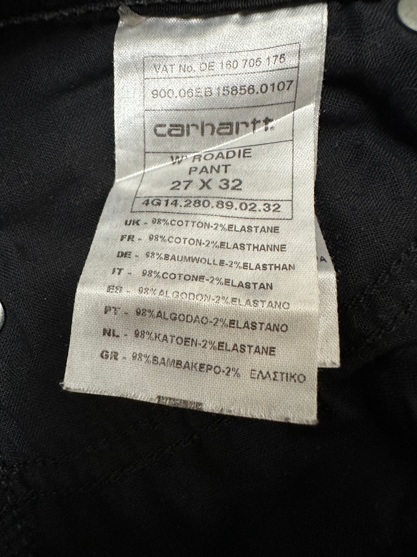 A sleek and versatile pair of black pants from Carhartt WIP, crafted in a soft stretch cotton for everyday comfort. The Roadie Pant features a classic five-pocket construction, clean lines, and a flattering slim silhouette. Perfect for daily wear, work or casual styling, it delivers the clean Carhartt look with added flexibility thanks to its elastane blend.