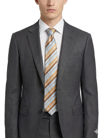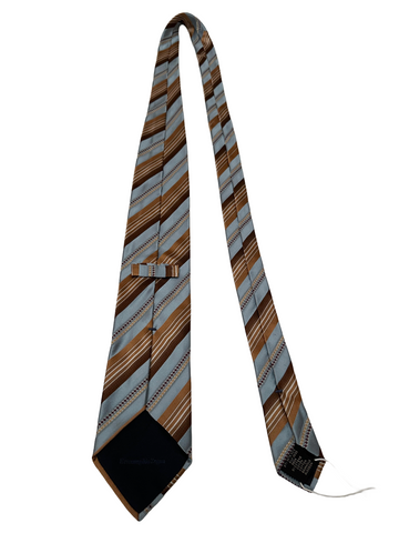 A refined Ermenegildo Zegna tie featuring a sophisticated mix of light blue, caramel brown, and chocolate stripe accents. The warm-cool contrast gives this piece a versatile and distinguished look, perfect for business, evening wear, or elevating a classic suit. Crafted in Italy from luxurious silk, it offers a smooth texture, elegant drape, and timeless Zegna craftsmanship.