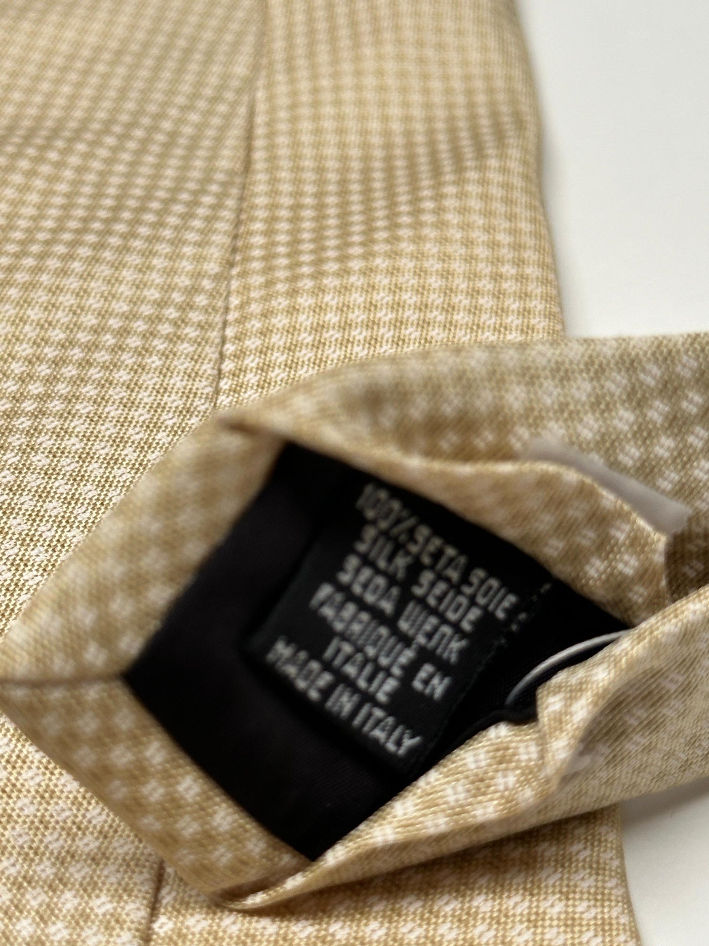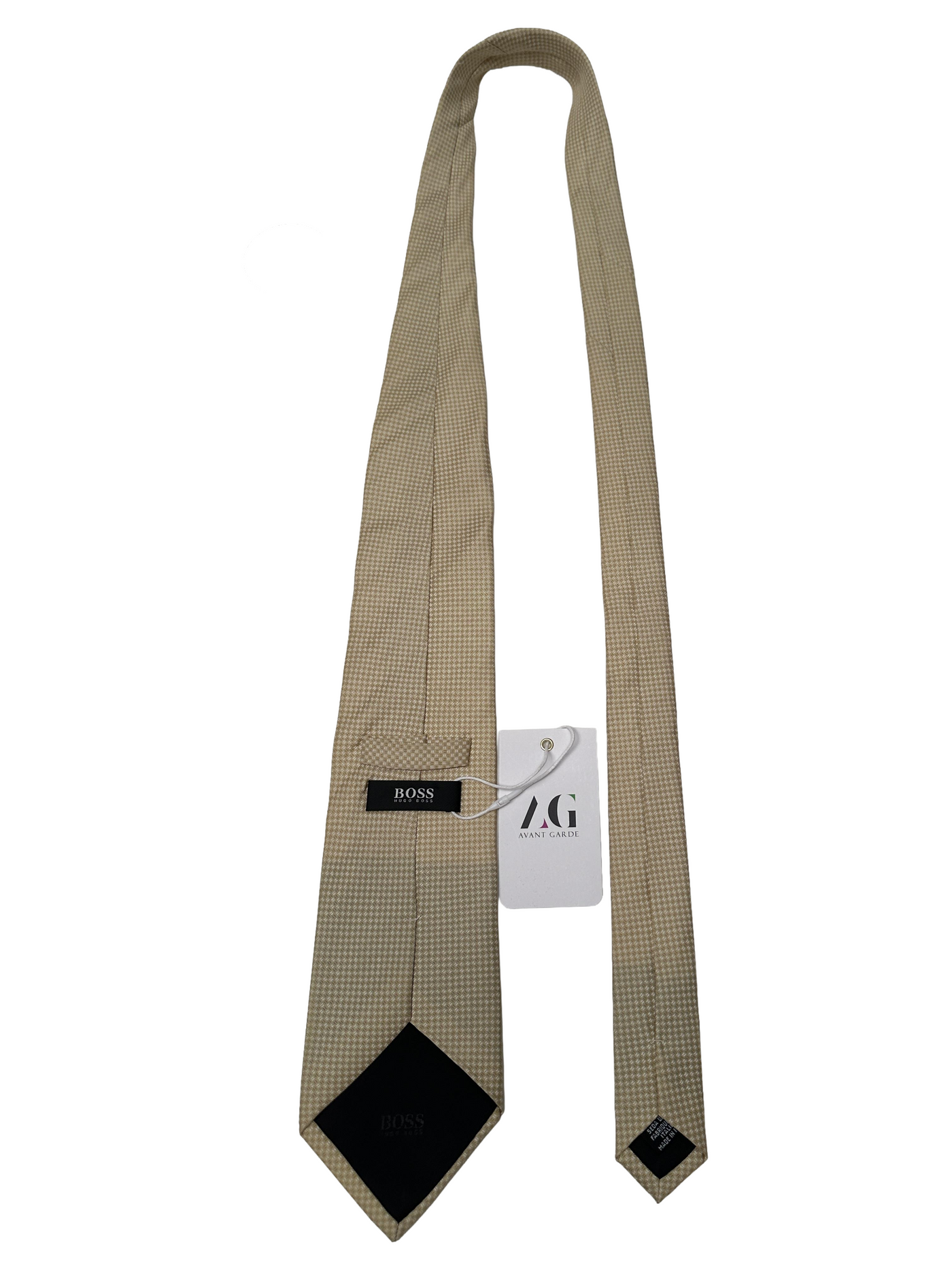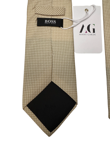 This elegant tie by Hugo Boss features a classic beige and cream houndstooth pattern, offering a refined and understated look. Crafted in Italy from pure silk, it has a smooth, subtle texture that pairs well with navy, brown, or grey suiting. A versatile accessory perfect for business or formal occasions.