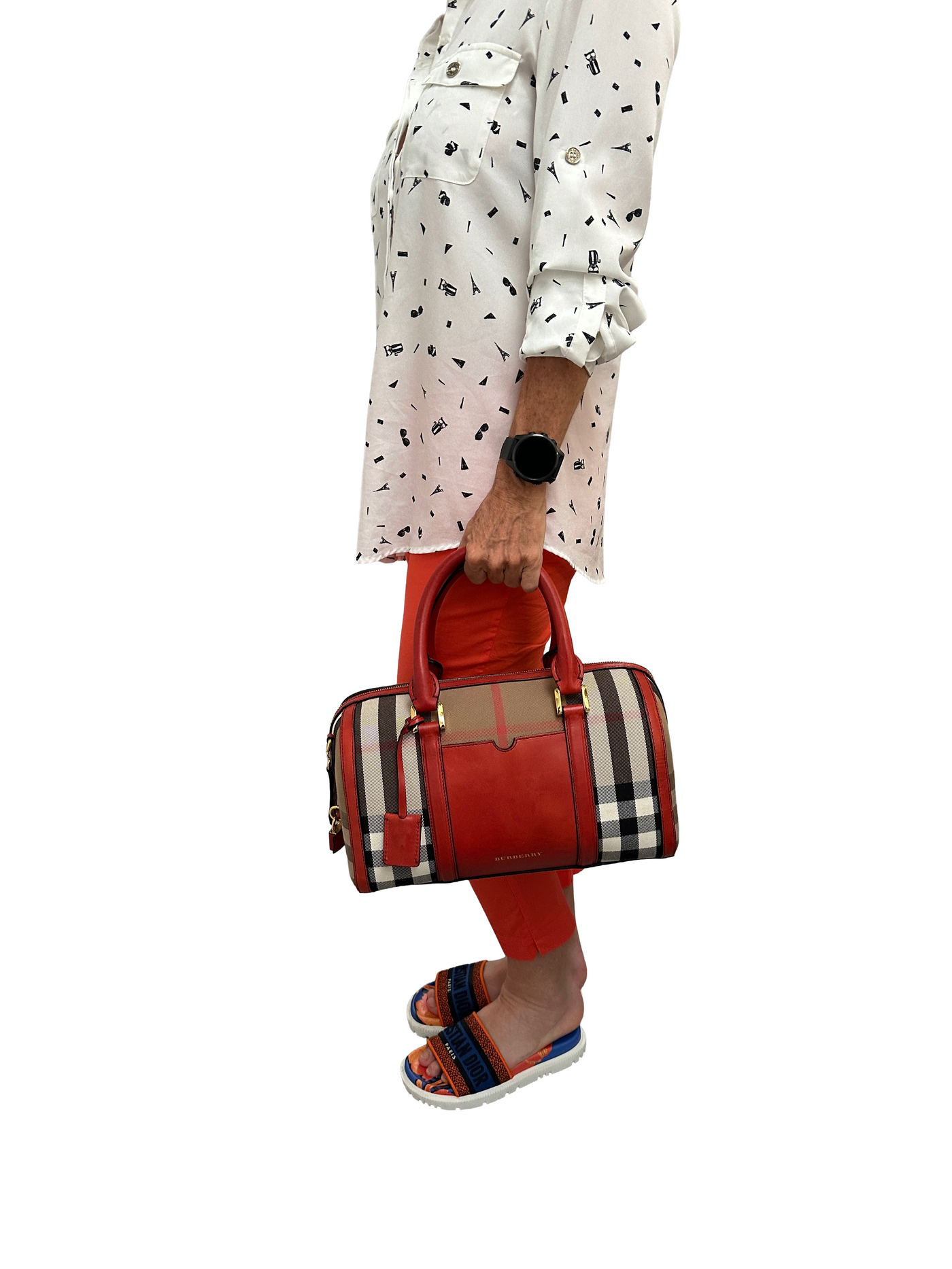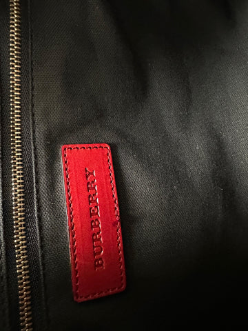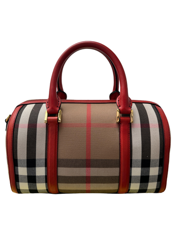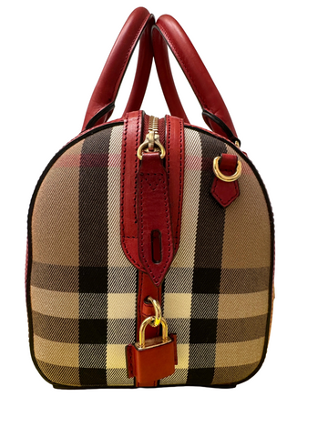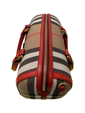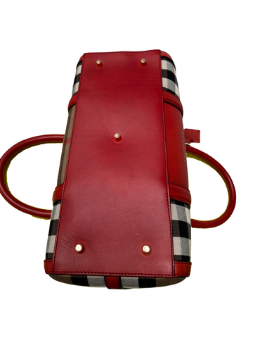 This Burberry Alchester medium bag is a striking statement piece, crafted in the brand's iconic house check canvas with vibrant red leather trims, handles, and base, adding a bold contrast to the neutral tones of the check pattern; it features gold-tone hardware, dual rolled leather top handles, a front patch pocket, and a structured silhouette; spacious and refined, it includes a top zip closure and an interior fully lined with additional compartments, making it both elegant and practical for everyday use or travel.